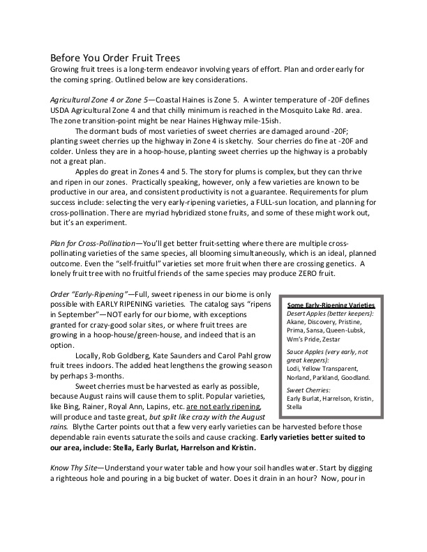 Presenters Blythe Carter of Haines and Rob Bishop of Hoonah (alaskaapplefarms.com) provide a 1-hr over view of the big ideas around starting a fruit tree orchard. This program lays the groundwork for subsequent programs in the 2021 Chilkat Valley Orchard Series. The program was held on Saturday, January 9 and had 80 Zoom participants from all over SE-Alaska. Learn more about Blythe and Rob under Our Team.